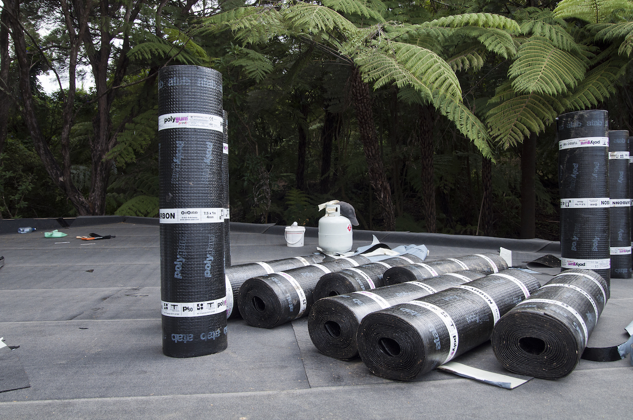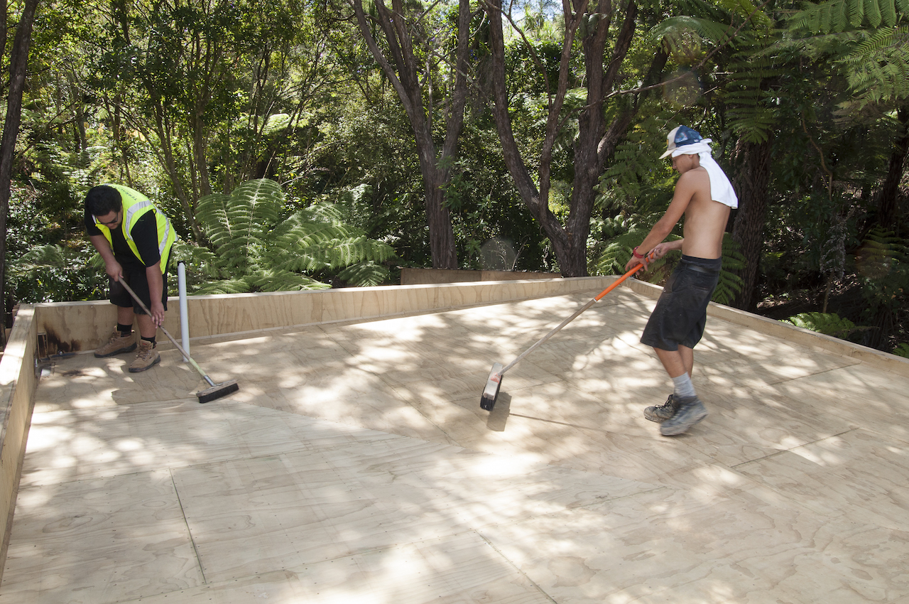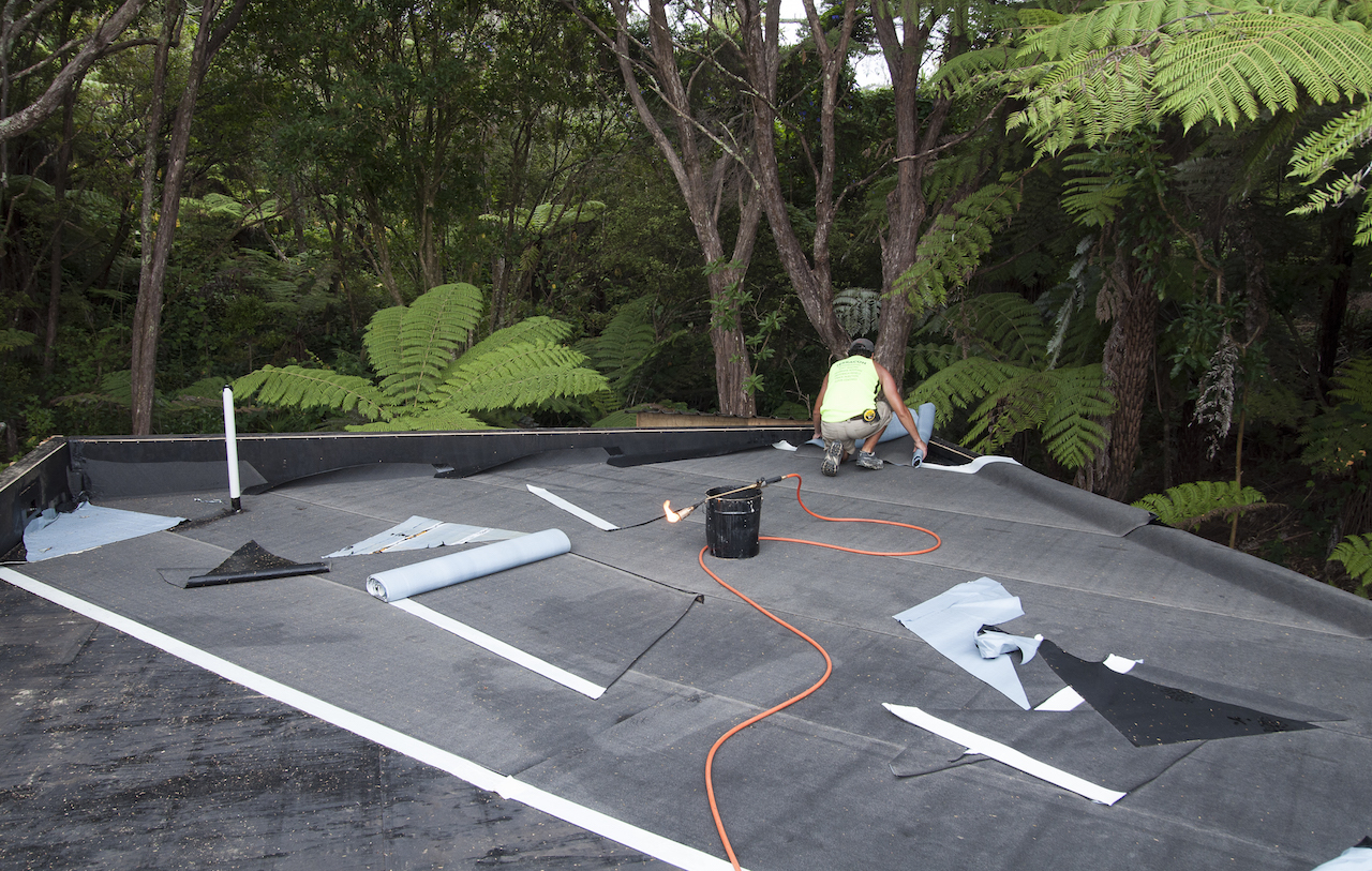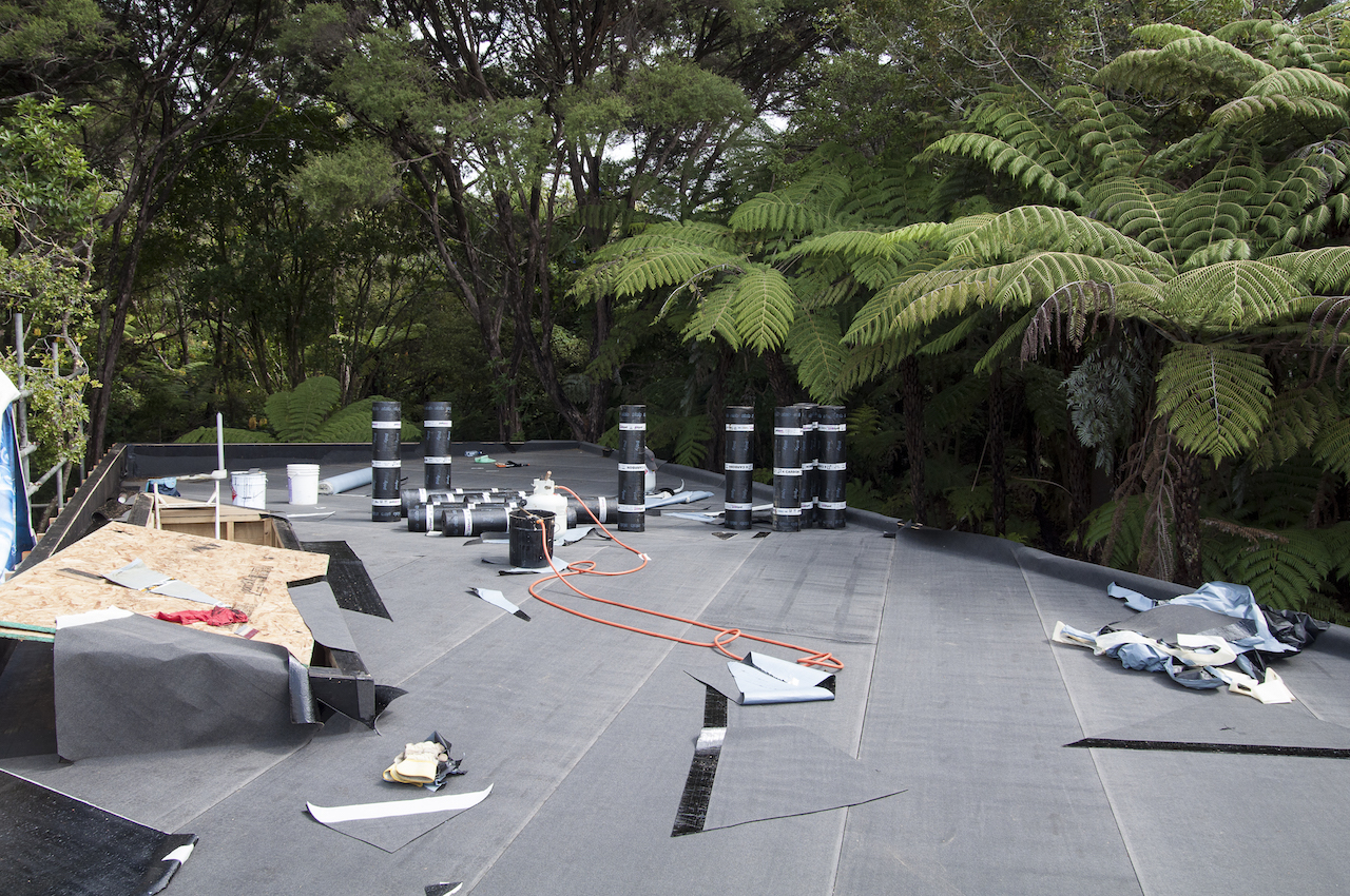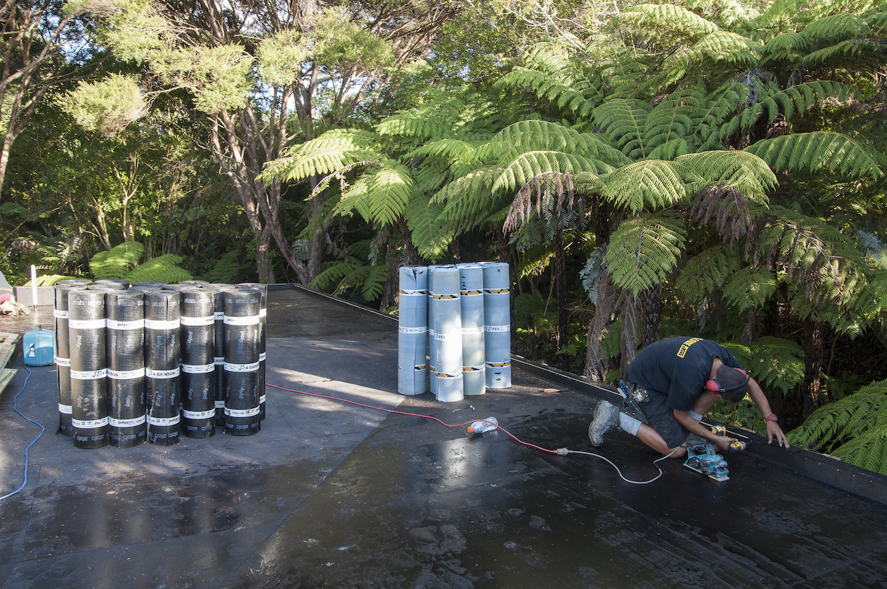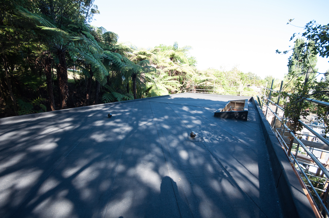 With the structure in place, it was time for Terracon Industries to come in and apply the Nuraply 3PM membrane system that makes the roof watertight and provides it with a striking finish. Terracon were one of three approved applicators that we considered. Kylie and I decided they were the guys for the job after meeting with owner Nigel Campbell in his Albany headquarters to discuss our plans. As well as being flat-roof application experts, we got on really well and clicked straight away, which I think is really important in the build process. And that hasn’t changed since. In fact they are some nicest guys we’ve had the pleasure of working with so far.