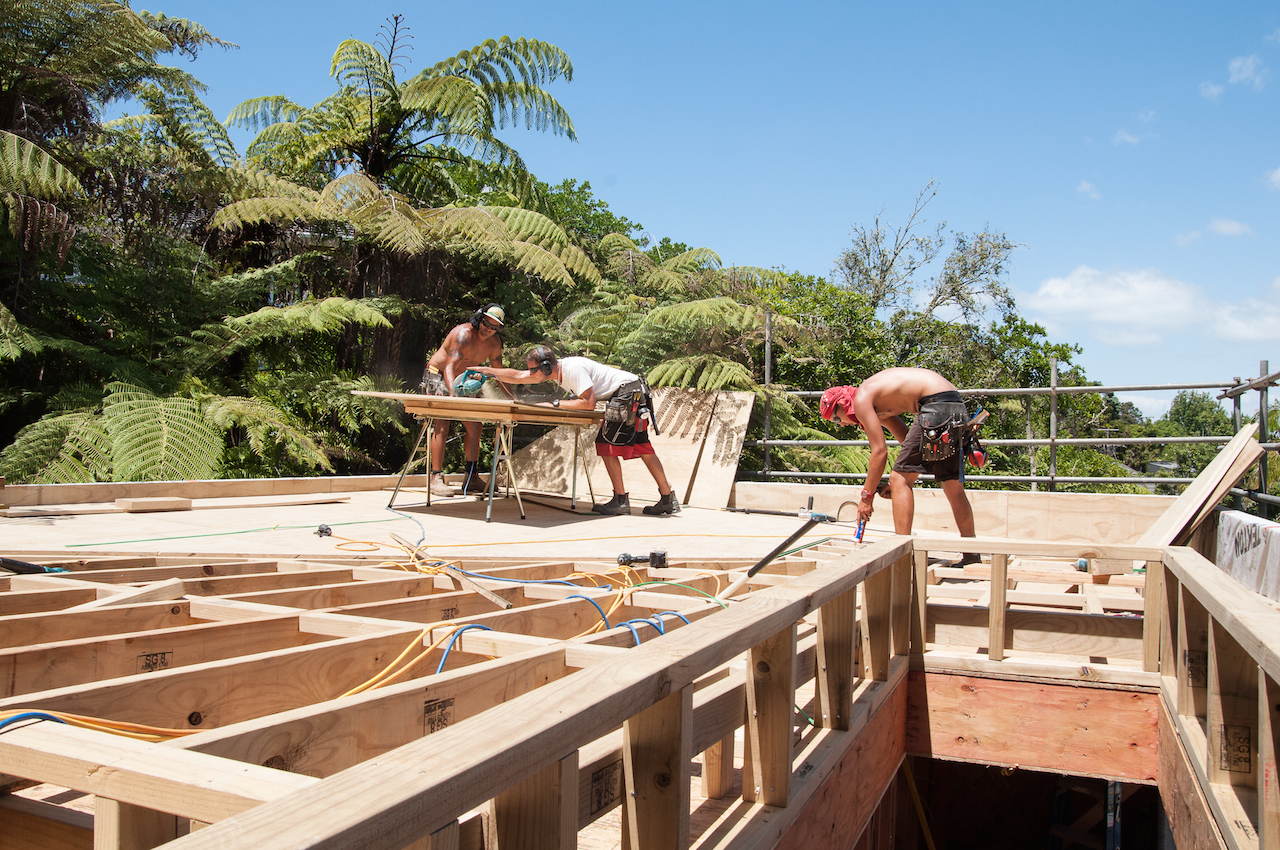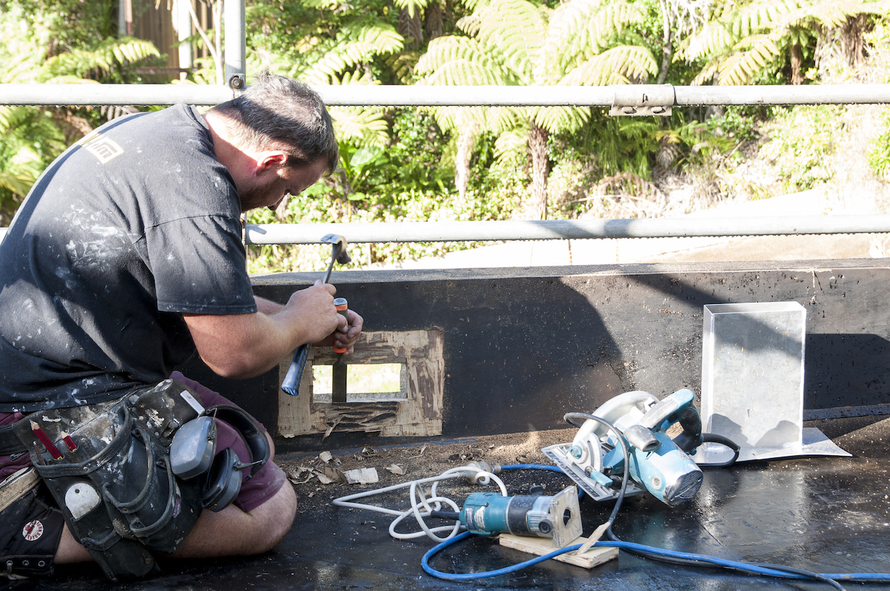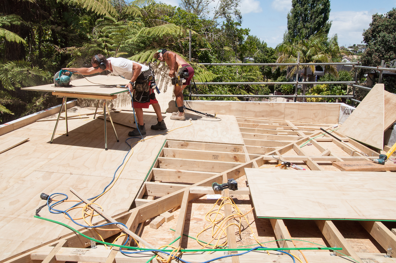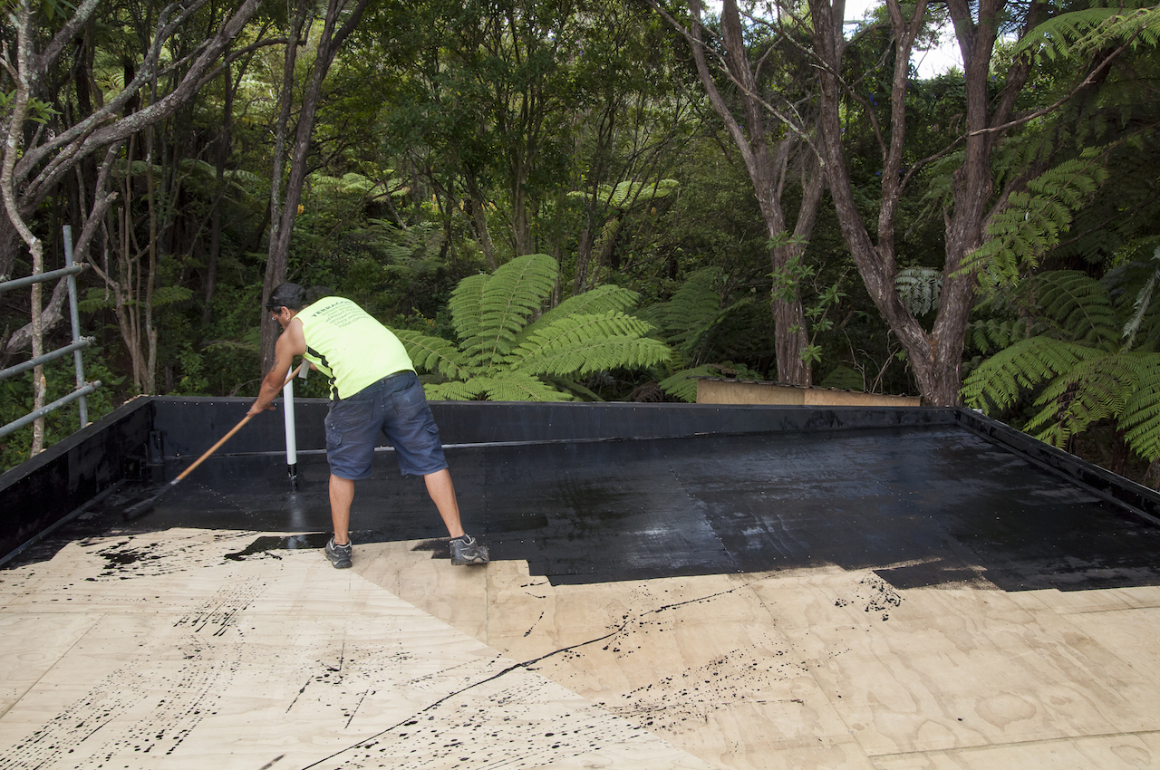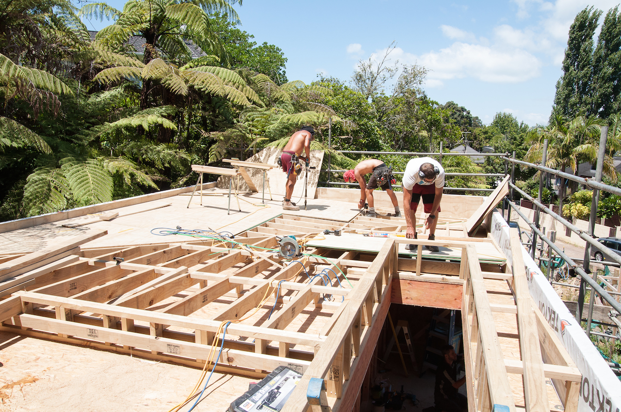 With the structure in place, it was time for Terracon Industries to come in and apply the Nuraply 3PM membrane system that makes the roof watertight and provides it with a striking finish. Terracon were one of three approved applicators that we considered. Kylie and I decided they were the guys for the job after meeting with owner Nigel Campbell in his Albany headquarters to discuss our plans. As well as being flat-roof application experts, we got on really well and clicked straight away, which I think is really important in the build process. And that hasn’t changed since. In fact they are some nicest guys we’ve had the pleasure of working with so far.