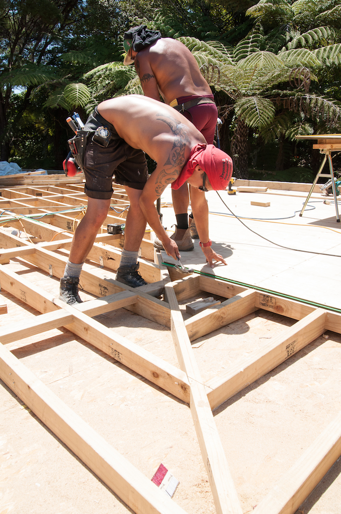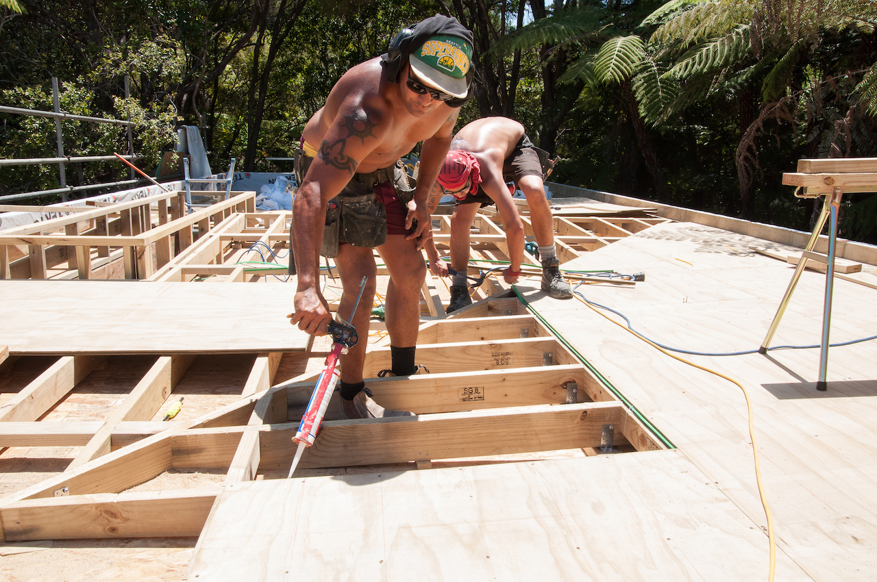 Then over the top of the framework the guys laid sheets of plywood which needed to be glued and screwed down.