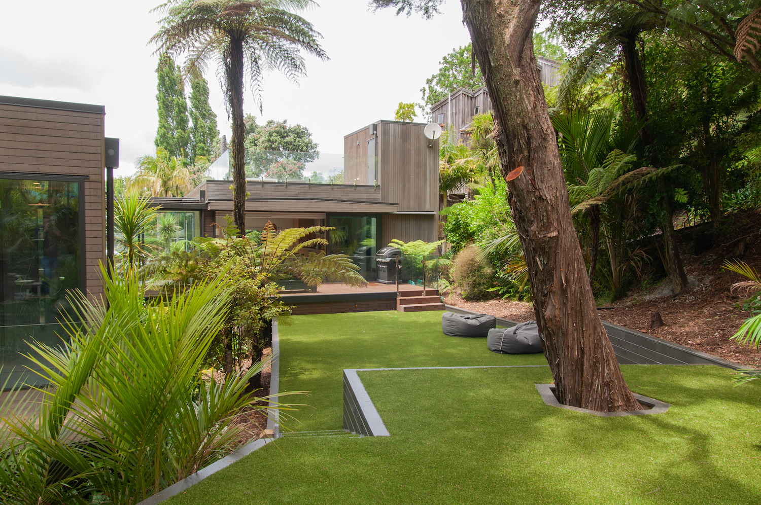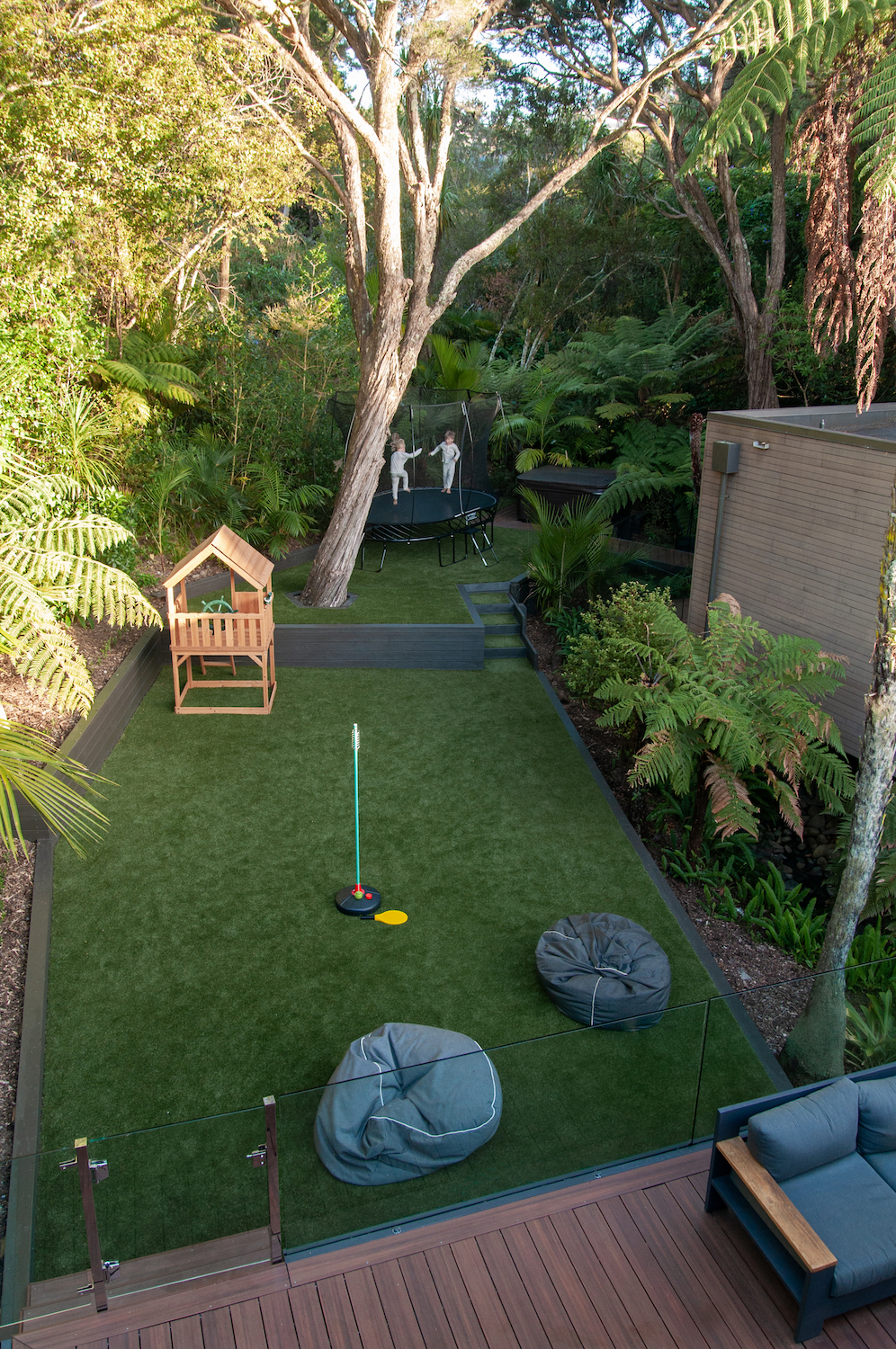 We couldn’t be happier with our decision to use turf. We were a little worried it might look a bit fake in such a natural setting, but we needn’t have worried, it looks incredible, very natural and is so low maintenance. But the biggest thing is just how usable it is – within 5 minutes of rain, it’s almost dry again and you never have to worry about mud again.