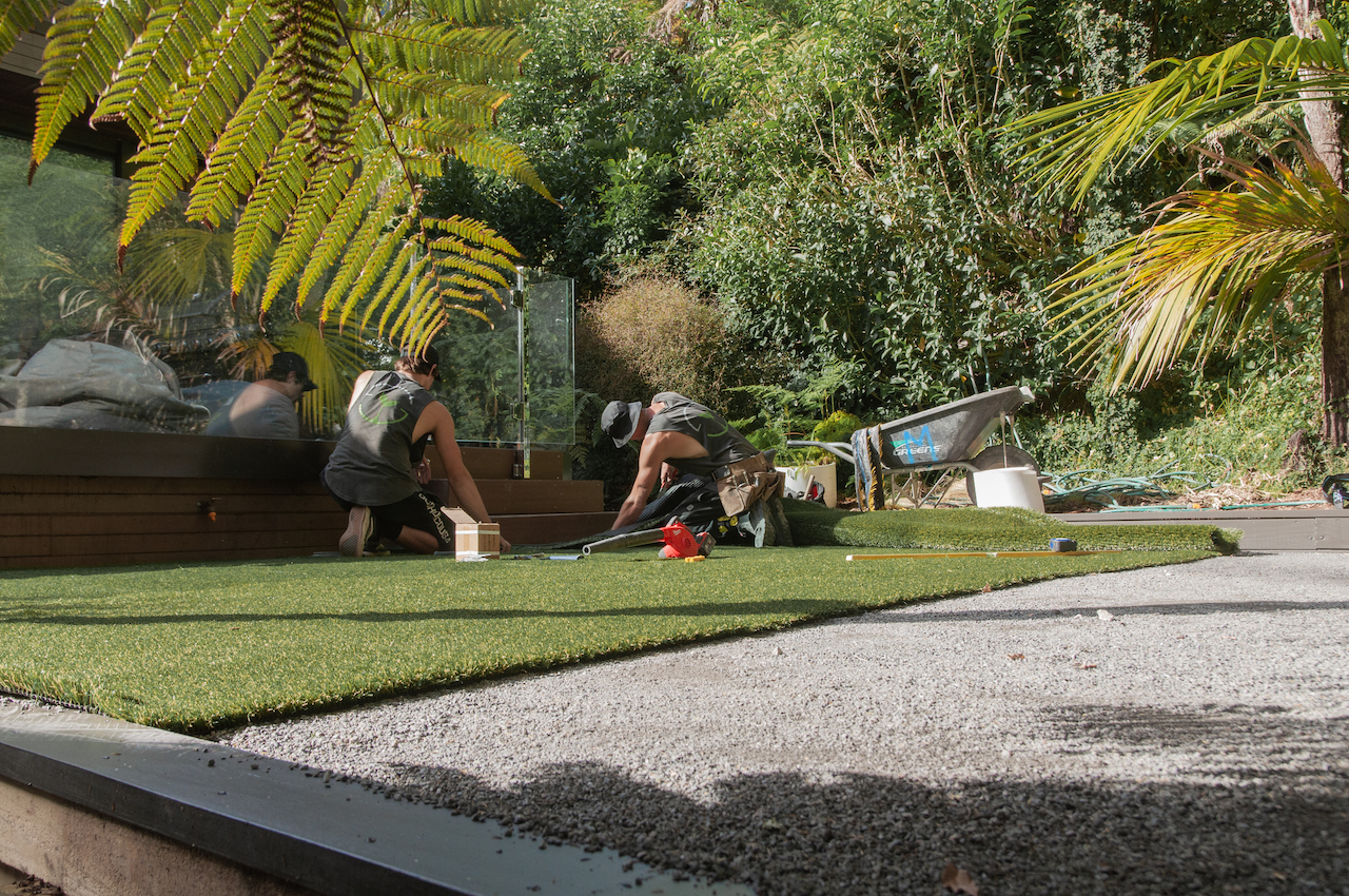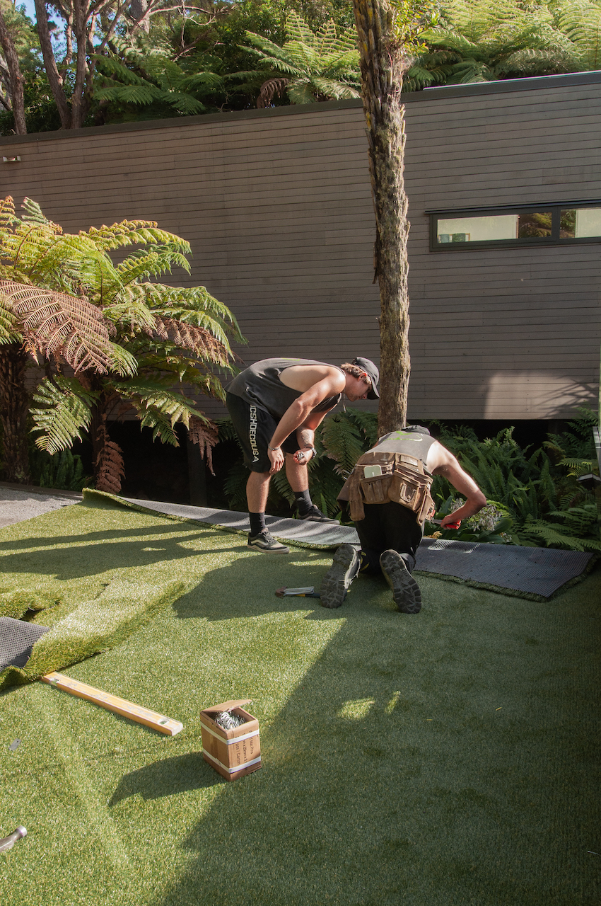 We asked Lance from Verdant Green to help us again and he did an amazing job forming the area, including approx. 60m3 of fill being carried in by hand. Then after speaking with a number of turf suppliers and looking at their products, we chose to use Urban Prestige from Urban Turf Solutions. It was the most natural looking grass we had seen and the Urban Turf team were awesome to deal with, coming out to look at the site and to talk through specs and install details with Lance.