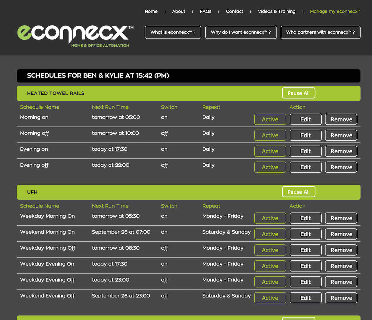 Our under floor heating and towel rails are also on schedules, which are quite different between the weekend and during the weekday. Which makes sense, we’re home more during the weekends so it’s nice to have the underfloor heating going, but while we are at work there is no need. Since we’ve had these schedules in place we’ve definitely noticed a reduction in power.